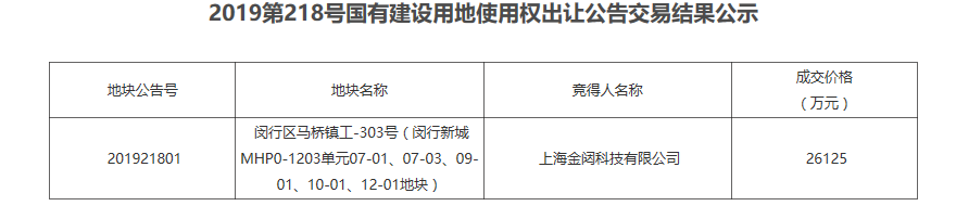 本周上海土地拍卖有1宗土地成功交易,成交地块位于闵行区马桥镇,地块名称闵行区马桥镇工-303号(闵行新城MHP0-1203单元07-01、07-03、09-01、10-01、12-01地块),该地块由上海金闼科技有限公司竞得,成交价2.6亿元。
