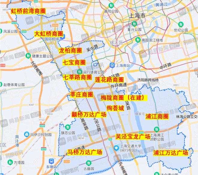 莘庄再往南片区的繁华程度有所降低,商业体也分散在各个片区,不过很多板块依然做到了商业布局,例如颛桥、马桥和浦江镇有万达广场,春申有绚荟城,而吴泾紫竹也有宝龙广场,虽然个体的商场不能形成商圈,但对于片区居民来说,足以满足日常所需。