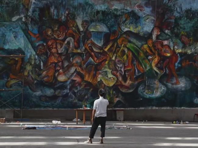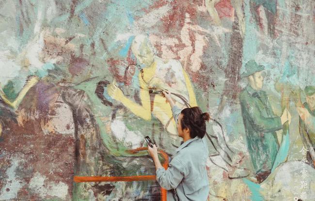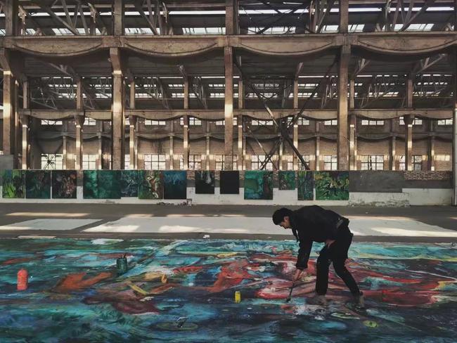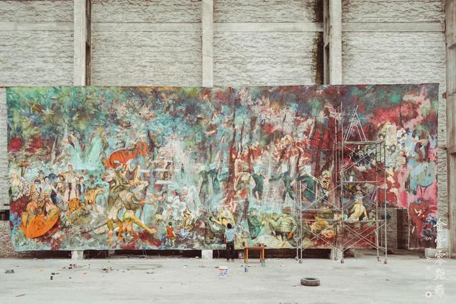 28米X8米的巨型油画,4层高的脚手架,随意摆放的油画颜料,还有一位专心创作的画师,这些就在川锅厂一间高大空旷的老厂房里面。