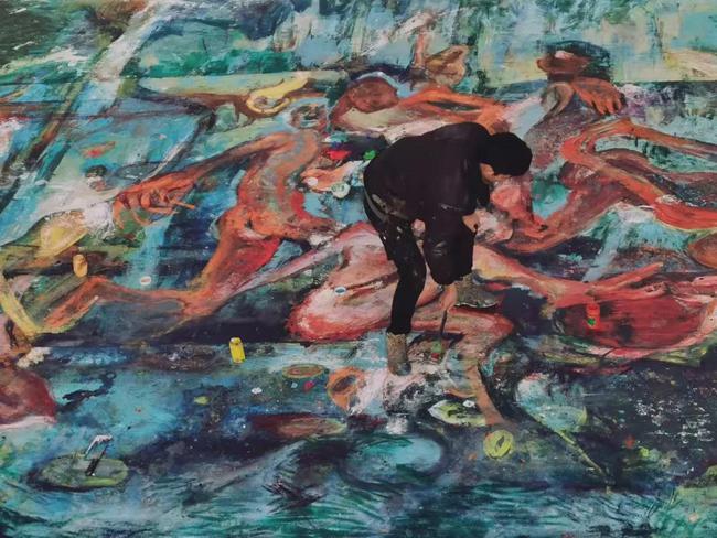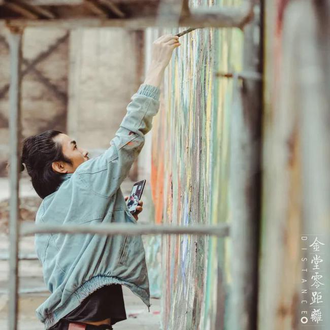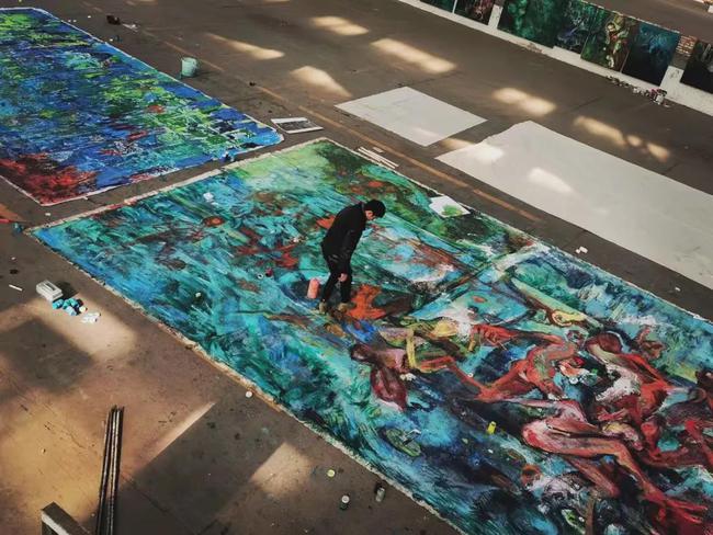 石主现在在创作的画是一幅宽20米高8米的巨型画作,他将手机上一张张现实世界的照片,通过艺术的创作,集中在眼前这一幅画布之上。