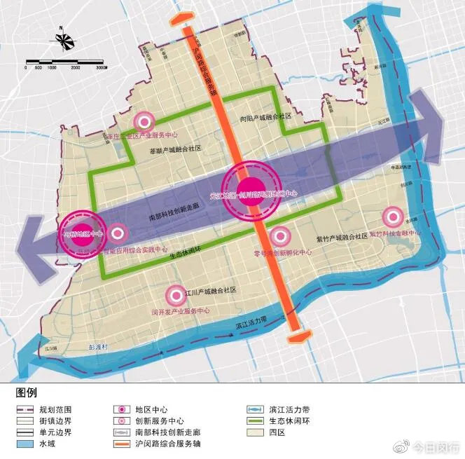 四区相融:“四区”指四个主要产城融合地区,即莘颛产城融合社区、江川产城融合社区、紫竹产城融合社区、向阳产城融合社区。明确为本地居民、尤其是创新人群提供品质化的居住及公共服务等。