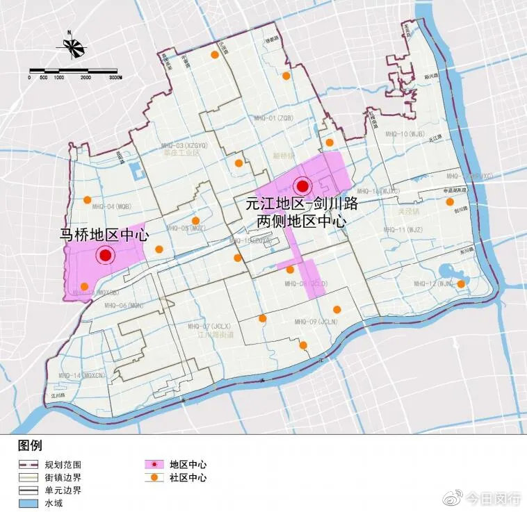 公共中心地区为元江地区-剑川路两侧地区中心、马桥地区中心。打造元江地区-剑川路两侧地区中心。联动元江地区、剑川路商务区、向阳工业区,通过园区、校区、社区的三区融合发展,重点培育科技创新、商业、文化等功能,形成服务闵行南部地区本地为主的特色服务中心。