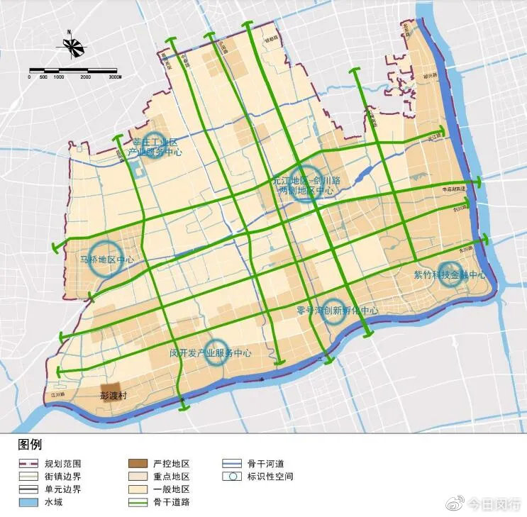重点地区:指影响城市空间格局、体现城市特质、展现城市或某一地区空间的形象标识性的地区。主要为元江地区—剑川路两侧地区中心、马桥地区中心、产业创新中心、黄浦江沿岸地区等,凸显公共活动中心的空间尺度特征,塑造中心城层面视觉核心。梳理重要道路、河流两侧的空间尺度关系。